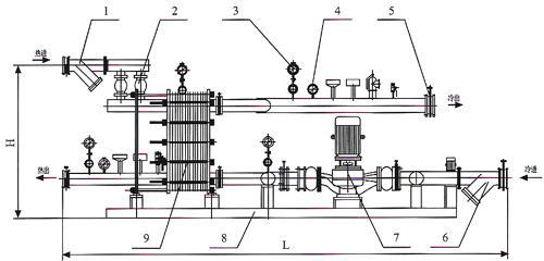 8.底座      9.板式換熱器    10.補水泵(如蒸汽供暖的機組,根據(jù)用戶要求可加裝蔬水器等)
