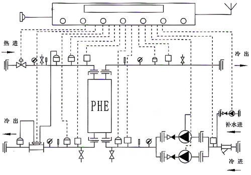 全自動無人值守現(xiàn)場控制換熱機組,具有手動控制換熱機組功能外,一次網(wǎng)配有電動調(diào)節(jié)閥,控制二次網(wǎng)的供水溫度,具有室外溫度補償功能,循環(huán)泵采用變頻控制,利用二次網(wǎng)供回水壓差作為反饋信號,二次網(wǎng)進行變量控制,不水泵采用變頻補水,根據(jù)二次網(wǎng)回水壓差作為反饋信號。所有水泵,電動調(diào)節(jié)閥,二次網(wǎng)供水溫度等均由控制器來完成全自動控制,并且控制器能夠控制程序來自動完成機組的啟停及復電后重新啟動,一個水箱水位傳感器接入控制器自動控制水箱水位。而且具有缺水保護不水泵功能;二次網(wǎng)回水管線加裝卸壓裝置,正常情況下,該機組處于無人值守自動運行狀態(tài),只需工作人員定期進行巡查。