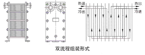 板式換熱器根據(jù)介質(zhì)的溫差和流量,可以裝配成單流程、雙流程、三流程以及多流程的形式。單流程是指介質(zhì)在換熱器內(nèi)流過(guò)一個(gè)流程,雙流程是指介質(zhì)在換熱器內(nèi)折返流過(guò)兩個(gè)過(guò)程,依次類(lèi)推,各種流程的外形圖和其流程示意圖如圖3。當(dāng)采用多流程時(shí),換熱器的四個(gè)接口就不能在同一側(cè)的夾緊板上,進(jìn)出口要位于前后兩個(gè)夾緊板上。