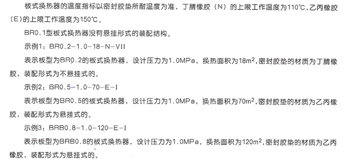 我公司生產(chǎn)的板式換熱器按照 GB16409-1996 《板式換熱器》進(jìn)行設(shè)計(jì)、制造和檢驗(yàn),代號(hào)也按其標(biāo)準(zhǔn)規(guī)定來(lái)表示。