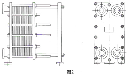 板式換熱器的結(jié)構(gòu)分解如圖1,產(chǎn)品外型如圖2,主要部件是由換熱板片、密封膠墊、夾緊板、導(dǎo)桿、夾緊螺栓組成。換熱板片是由不銹鋼板壓制成型,它上面開(kāi)有4個(gè)流道孔,中部壓成人字形波紋,四周壓有密封槽。密封槽內(nèi)粘有密封膠墊。換熱板片通過(guò)兩導(dǎo)桿定位對(duì)齊,兩夾緊板通過(guò)夾緊螺栓將各板片壓緊,從而形成換熱器內(nèi)腔換熱流道。相鄰換熱板片的人字形波紋方向安裝時(shí)相反,接觸點(diǎn)彼此相互支撐。人字形波紋和這些支撐點(diǎn)使流體介質(zhì)在其內(nèi)部流動(dòng)時(shí)充分形成湍流,這是板式換熱器具有很高換熱效率的主要原因。另外換熱板片厚度較薄,導(dǎo)熱熱阻較小,板片兩側(cè)的流體介質(zhì)流動(dòng)分布較為均衡,也使得傳熱較為充分。
